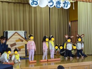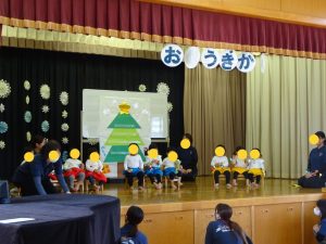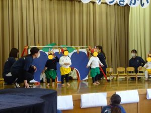 ステージ裏では泣いていた子も、幕があいて、いつもの先生たちの優しい声が聞こえてくると自然と泣き止んで、大好きな絵本の世界に入り込んだり、一緒に手遊び歌をしたり、体を動かして表現することができました✨