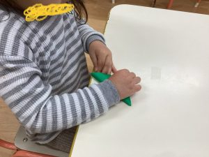 端と端を綺麗に合わせながら折ることがまだ難しい様子もありましたが、三角ができるように自分の力で頑張って折っていました!