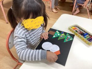 シール貼りは、楽しむ中でも、シールを台紙から剥がして、好きな場所に貼る、この指先を使う練習にもなっています!