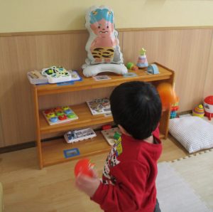 風船の鬼さんに向かって豆まきの練習もしましたよ〜♪