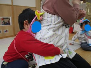 いざ鬼が来ると、びっくりして泣いてしまうお友達、怖いながらも必死で豆を投げて退治しようとするお友達、先生やお友達の後ろに隠れるお友達、色々な姿が見られました❤